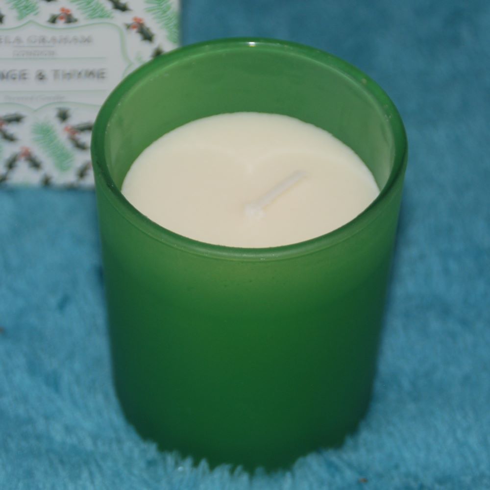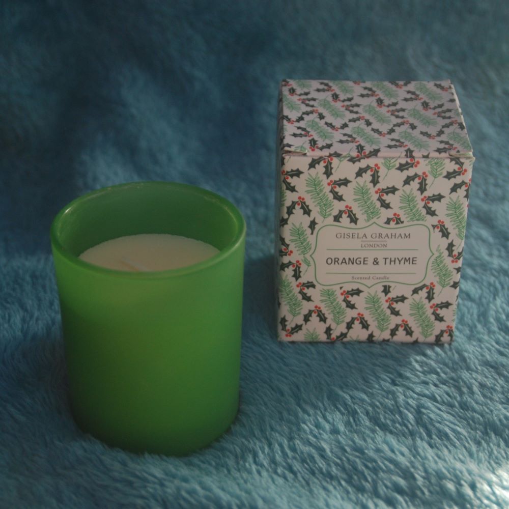 A richly scented Christmas candle by Gisela Graham. Bring Christmas to life with the aroma of Orange and Thyme. Encased in a robust coloured glass.