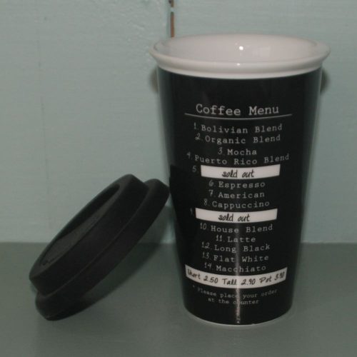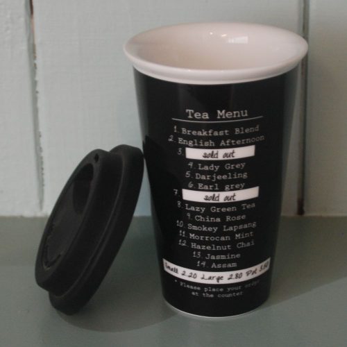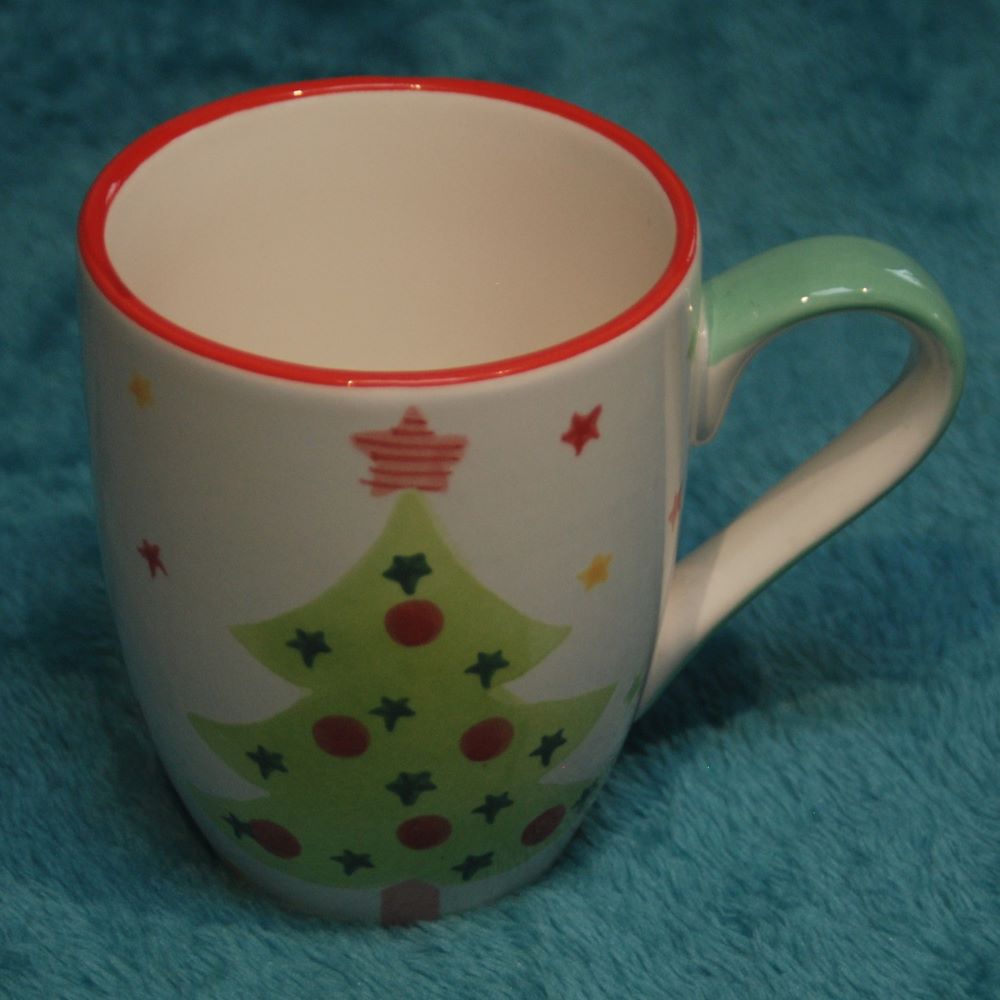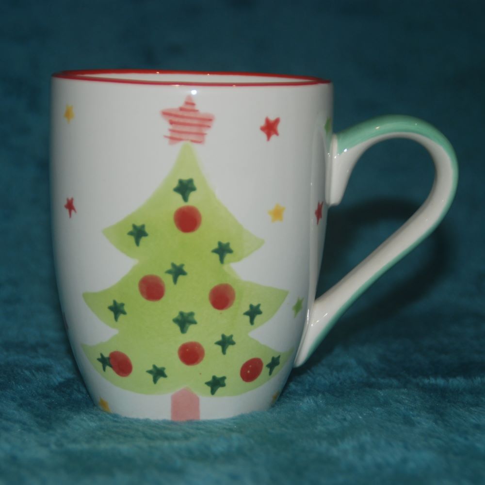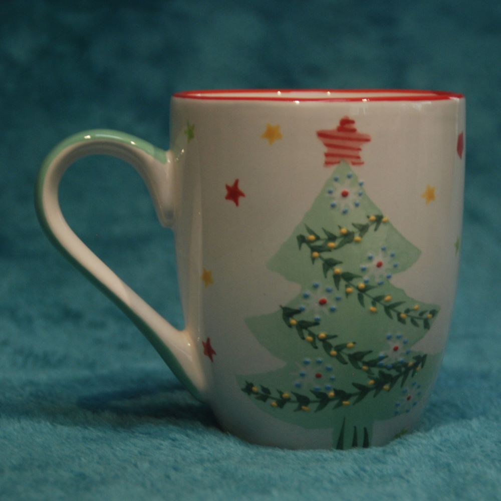A large ceramic mug beautifully decorated with a colourful Christmas tree design by Gisela Graham.