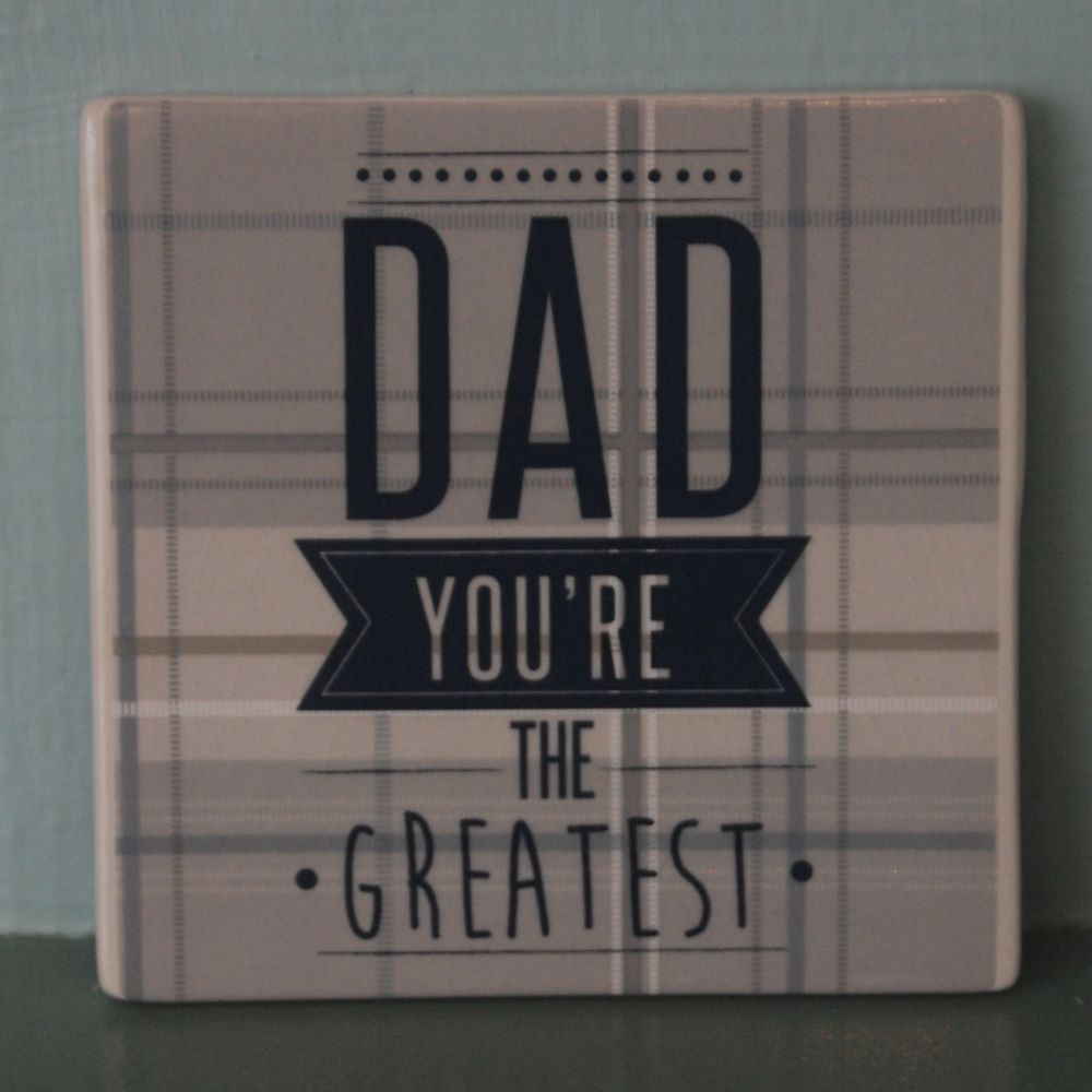 A ceramic coaster with the sentiment “Dad you’re the greatest” from Gisela Graham.