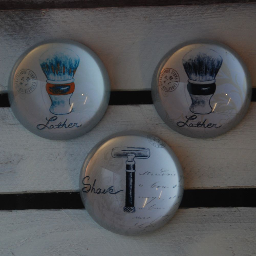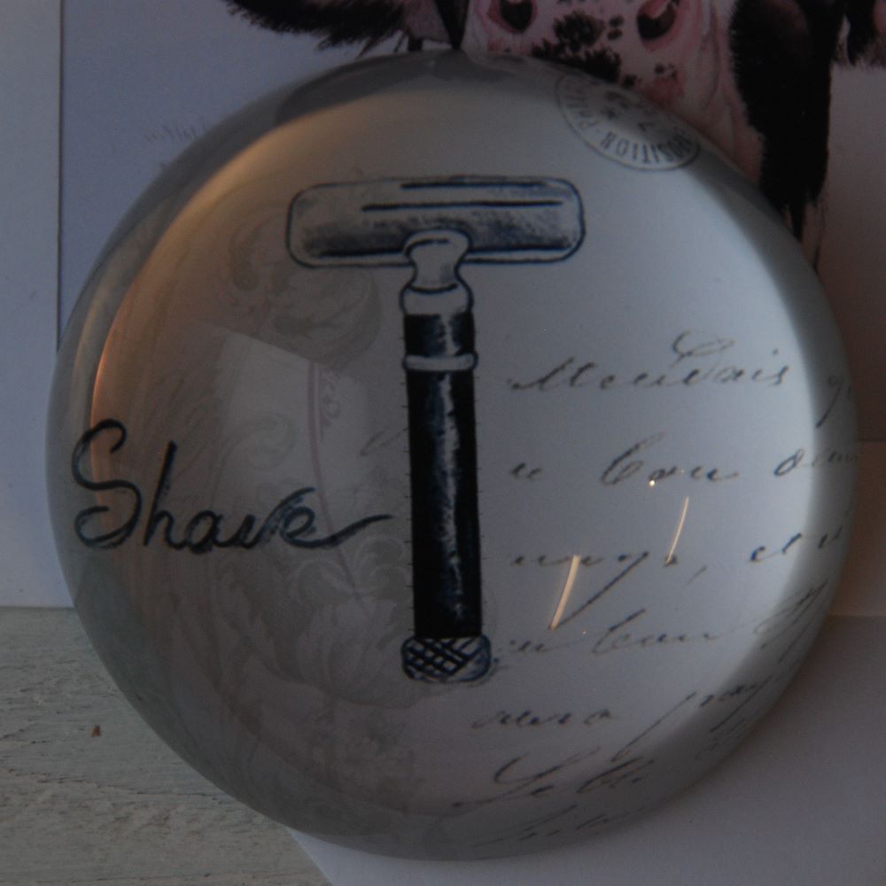 A classical round glass paperweight with a traditional black & white vintage shaving razor design.