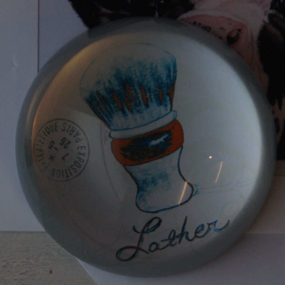 A classical round glass paperweight with a traditional colour lather brush design.
