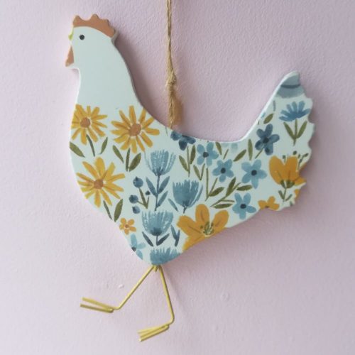 A delicate fretwork egg hanging decoration by Gisela Graham. This wooden fretwork egg is decorated with glittered daffodils and an Easter chick.