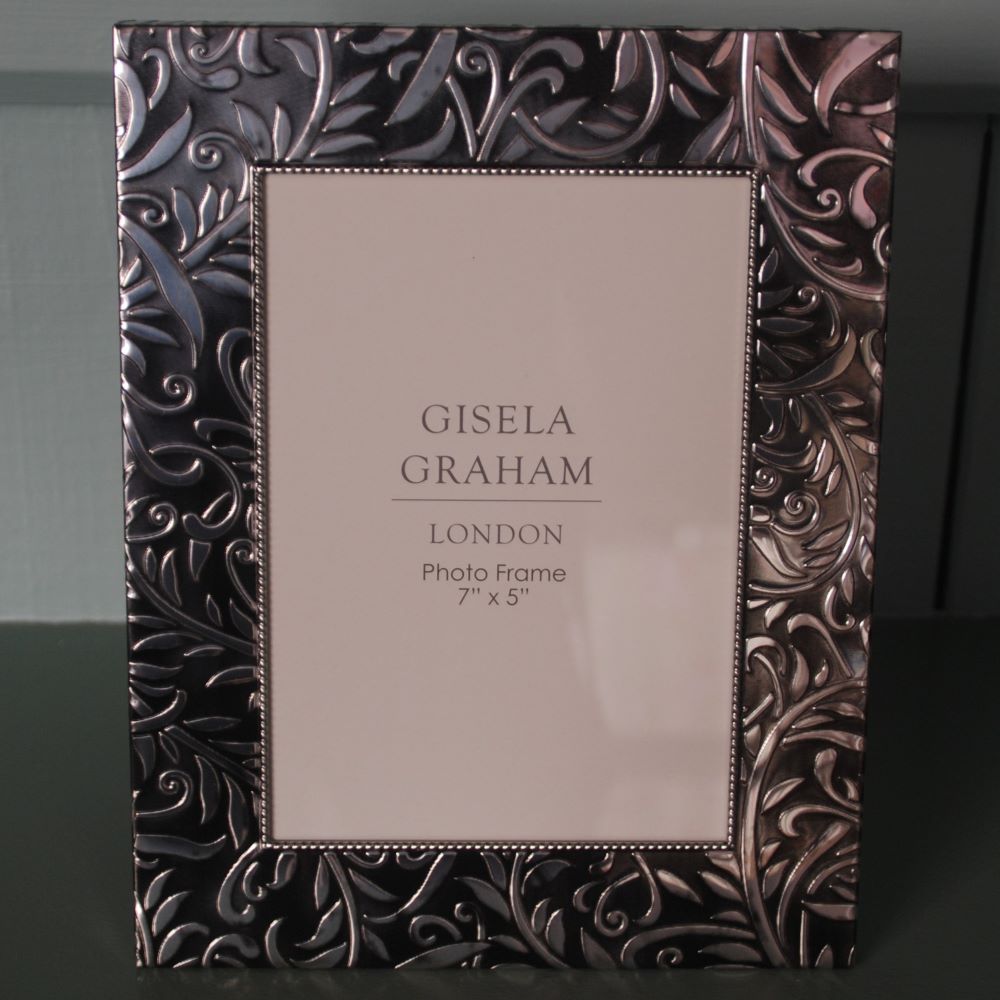 A beautiful pewter frame with embossed floral design. This lovely picture frame by Gisela Graham is free standing and has an aperture for a 7″ x 5″ (178mm x 128mm) portrait picture