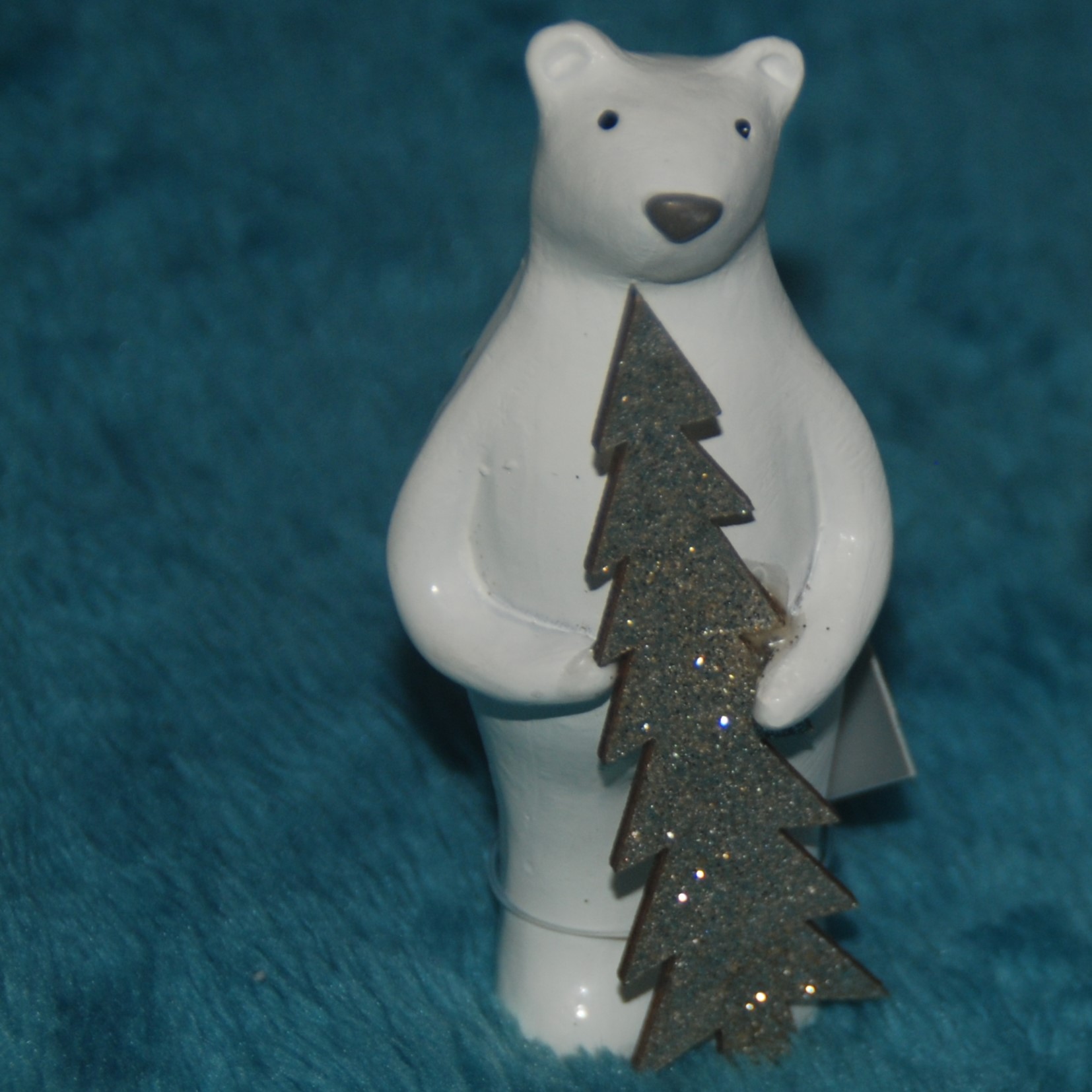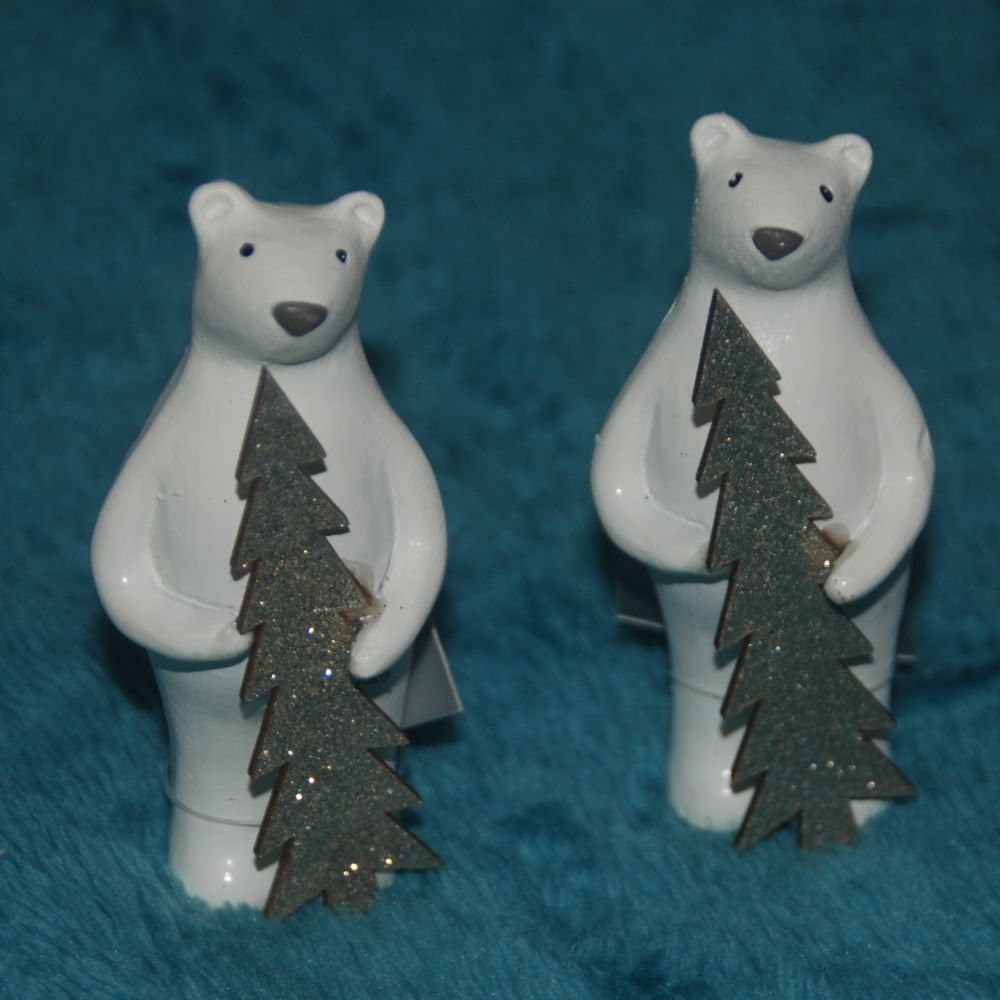 A cute polar bear holding a glittering Christmas tree by Gisela Graham. Elegantly detailed this is the perfect decoration for a bookcase or shelf. White with a silver tree.