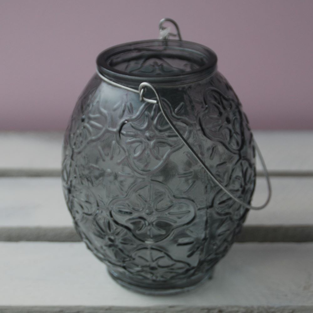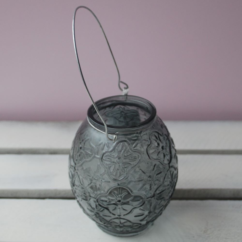 A smoked glass t-light embossed with a swirling pattern and wire carrying / hanging handle from Gisela Graham. This t-light is a stylish way to shelter your candle from a light breeze (do not leave glass out side during freezing weather).  Use standard t-light candles or electric equivalent (not included).