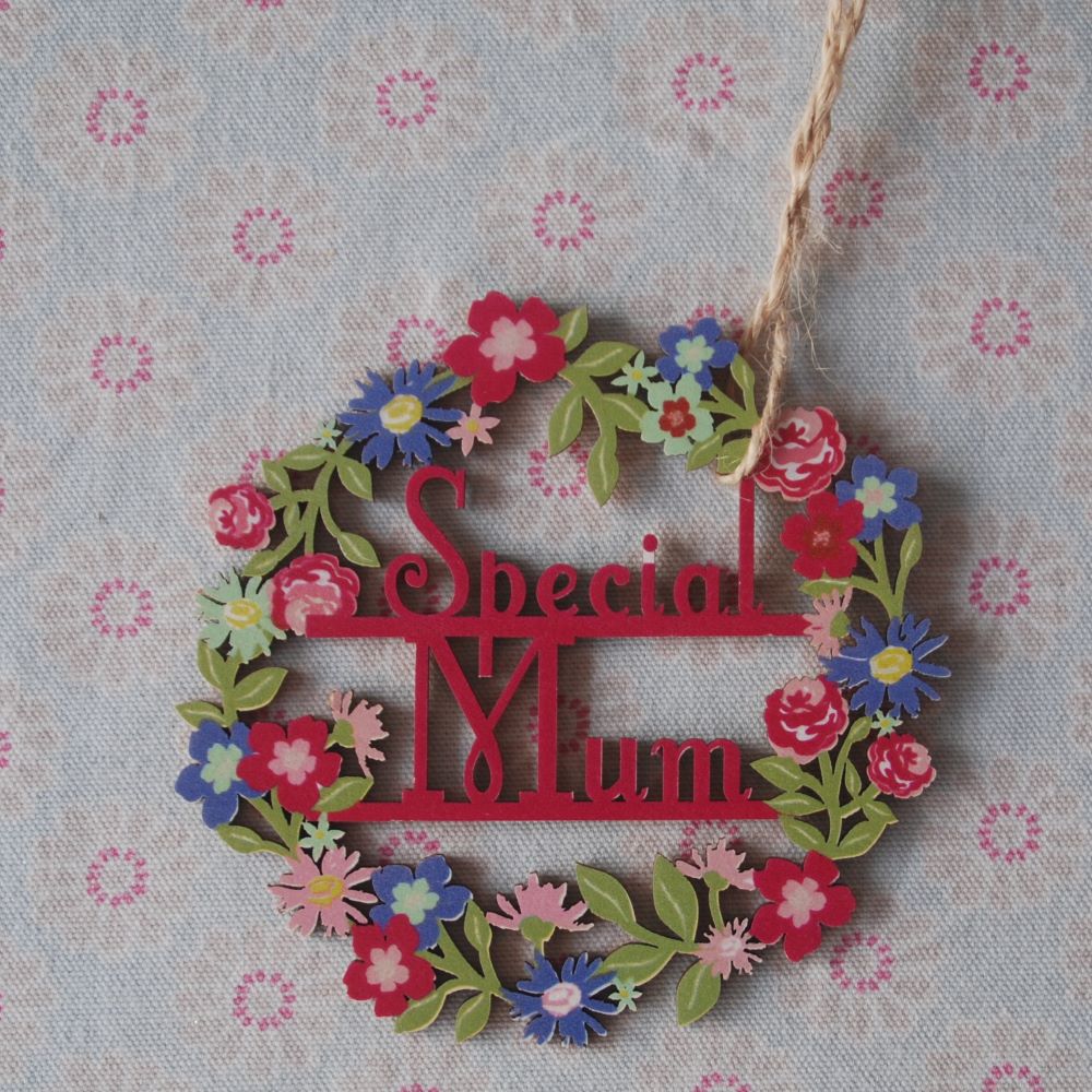 A “Floral song” special mum wreath hanging decoration by Gisela Graham. This wooden fretwork wreath is decorated with flowers and the sentiment of special mum. A beautiful gift to give your mother for Mothers Day, her birthday, or any other day you wish to show how special she is.