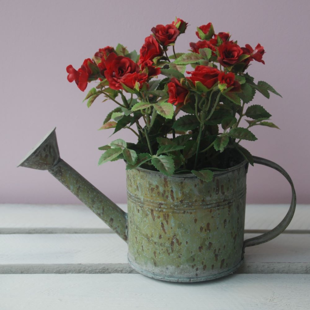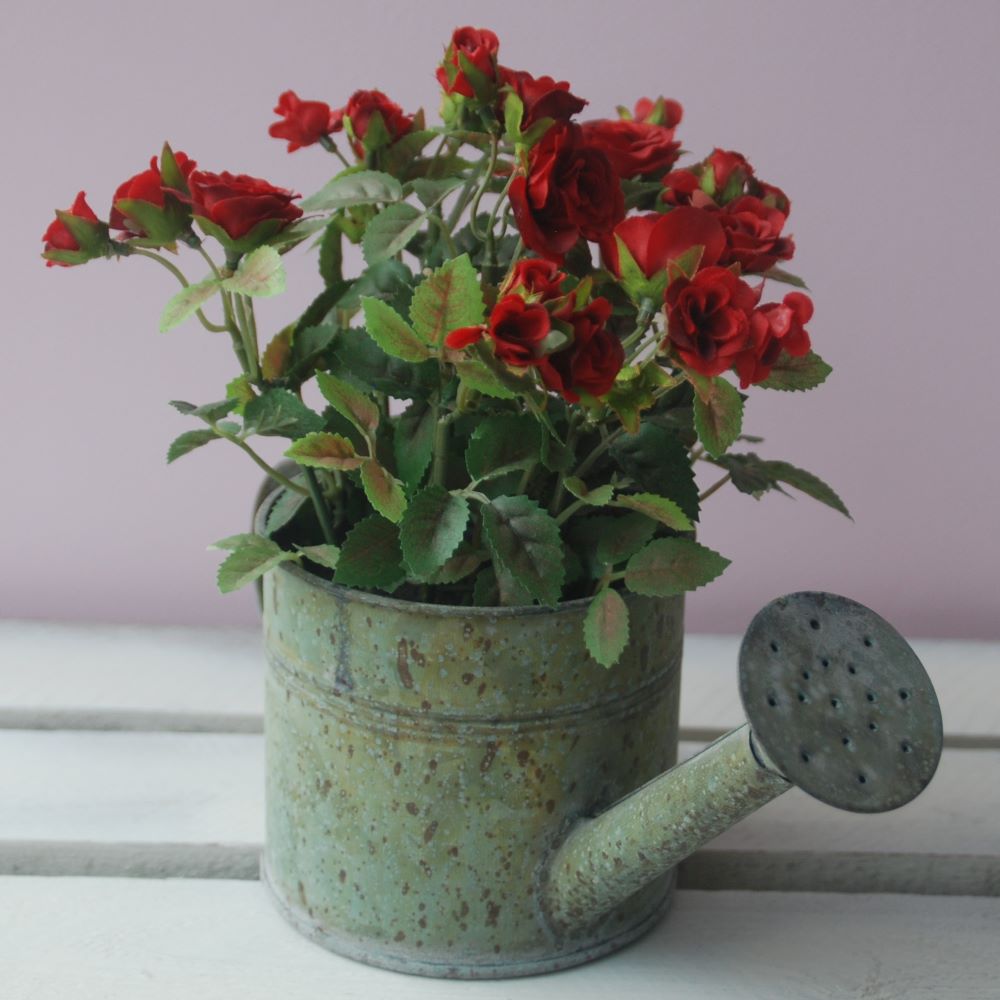 A stylish rustic metal watering can containing artificial red roses from Gisela Graham.